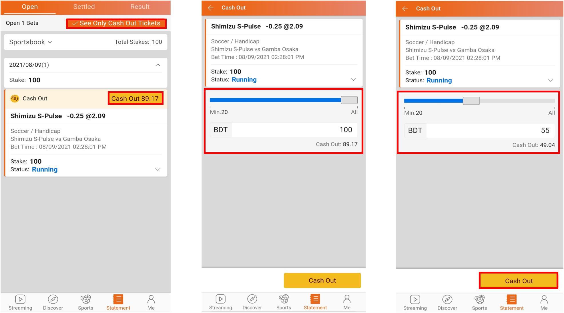 ধাপ ৪: ক্যাশ আউট করতে সরাসরি একটি স্লাইডার বা ইনপুট স্টেক ব্যবহার করুন। অনুগ্রহ করে মনে রাখবেন যে ন্যূনতম আংশিক ক্যাশ আউট বেট টিকিটের মূল অংশের কমপক্ষে ২০% পর্যন্ত করা যাবে।