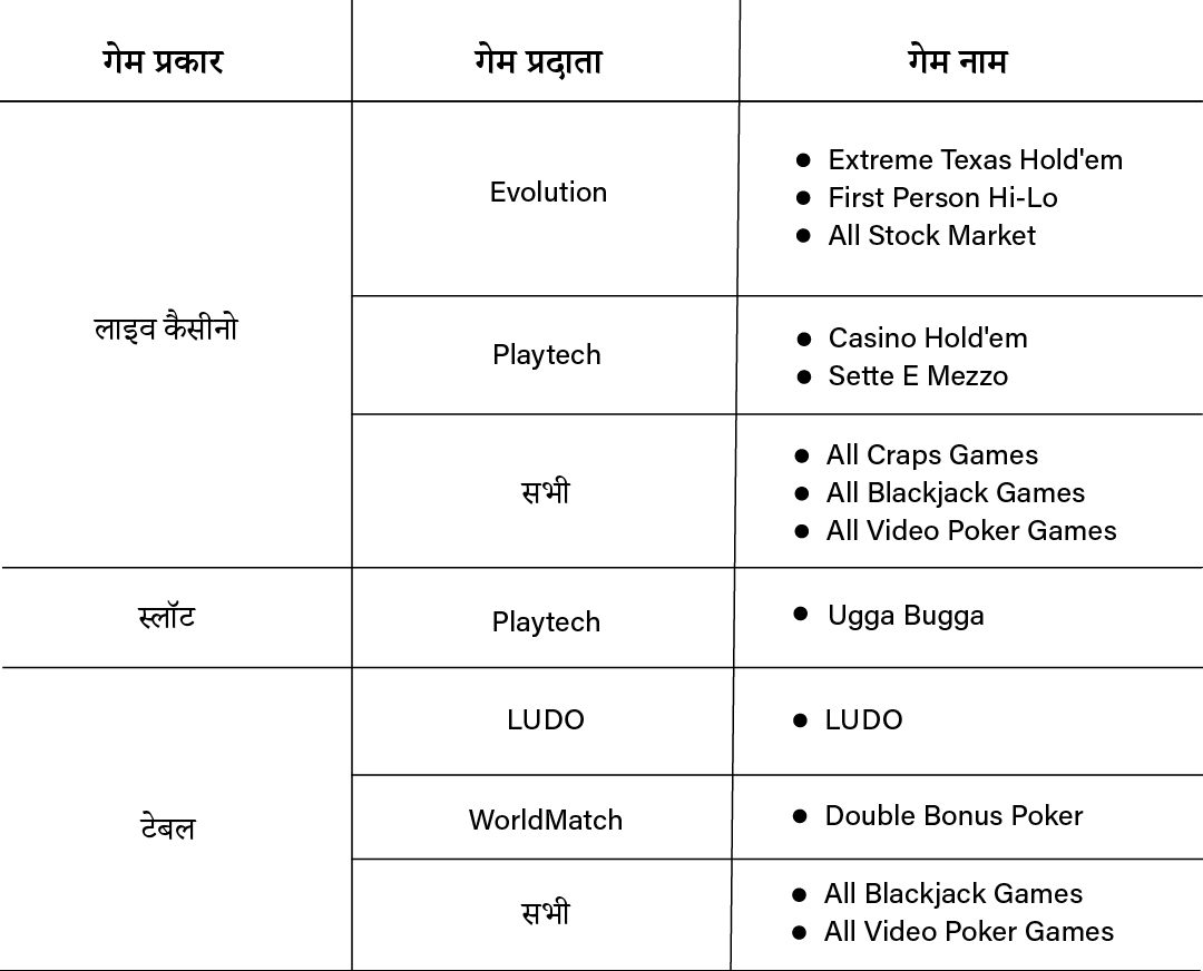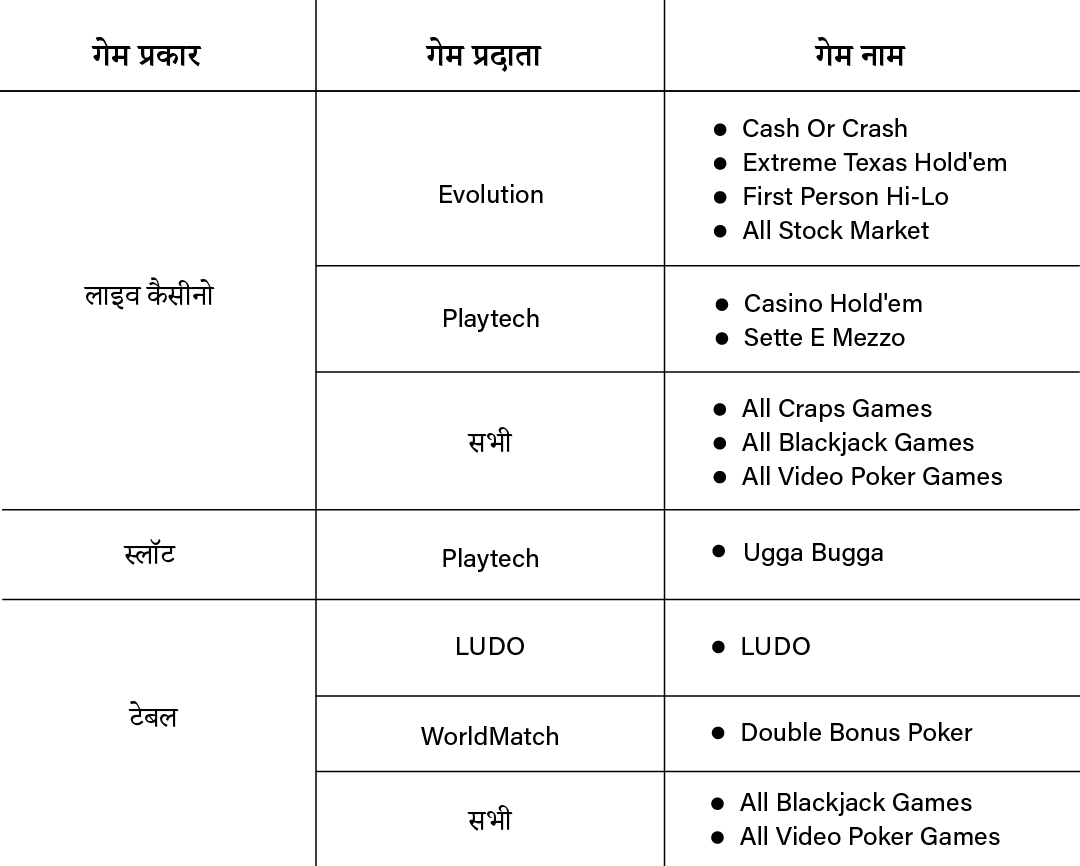 जबकि हमारे प्लेटफार्म पर ज़्यादातर दांव VIP पॉइंट अर्जित करने के लिए गिने जाते हैं, इस नियम के अपवाद भी हैं। VIP पॉइंट अर्जित करने से बाहर रखे गए गेमों के विवरण के लिए, कृपया नीचे दी गई तालिका देखें: