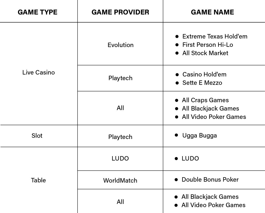 While most bets on our platform count towards earning VIP Points, there are exceptions to this rule. For details on the games excluded from earning VIP Points, please refer to the table below: