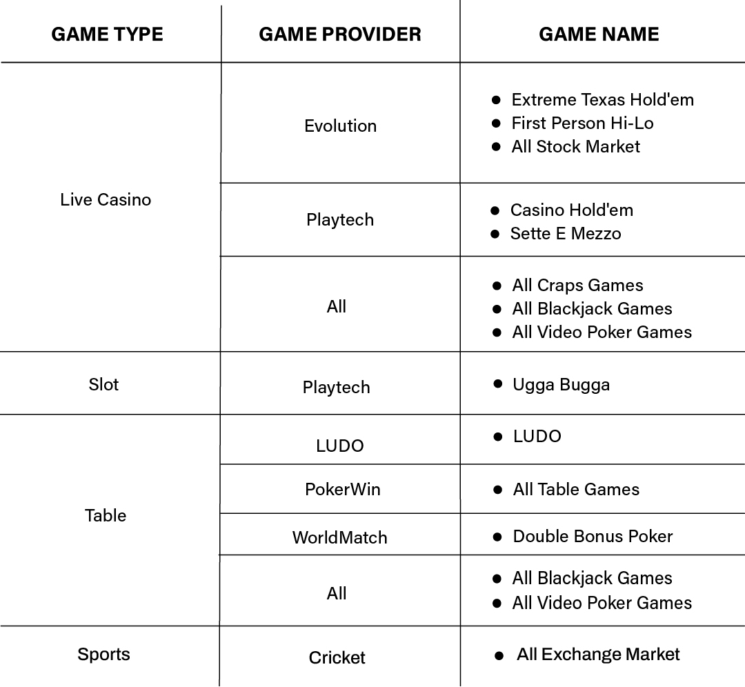 While most bets placed on our platform can be counted towards turnover calculation, and the bonuses we offer can be used on a wide range of games, there are some exceptions. For detailed information about the games and sport markets excluded from bonus wagering and turnover calculations, please refer to the table below: