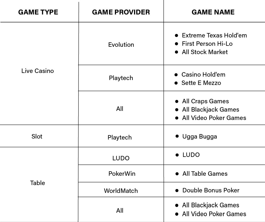 While most bets on our platform count towards earning VIP Points, there are exceptions to this rule. For details on the games excluded from earning VIP Points, please refer to the table below: