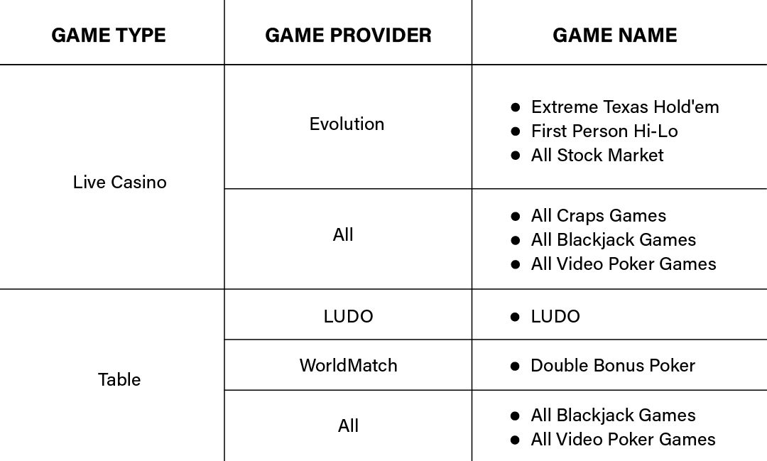 While most bets on our platform count towards earning VIP Points, there are exceptions to this rule. For details on the games excluded from earning VIP Points, please refer to the table below: