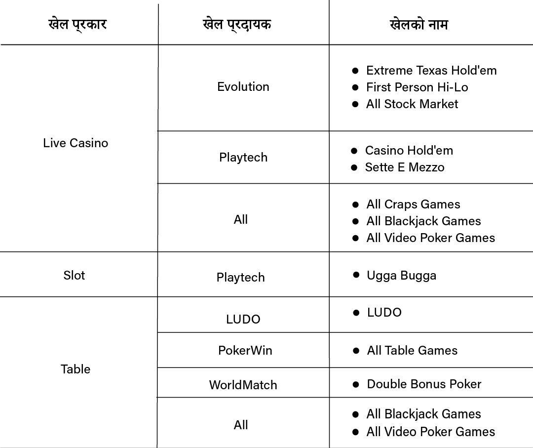 हाम्रो प्लेटफर्ममा अधिकांश सट्टाबाजीहरूले VIP पोइन्ट्स कमाउन मद्दत गर्छ, तर केही अपवादहरू छन्। VIP पोइन्ट्स कमाउन समावेश नगर्ने खेलहरूको विवरणका लागि तलको तालिका हेर्नुहोस्: