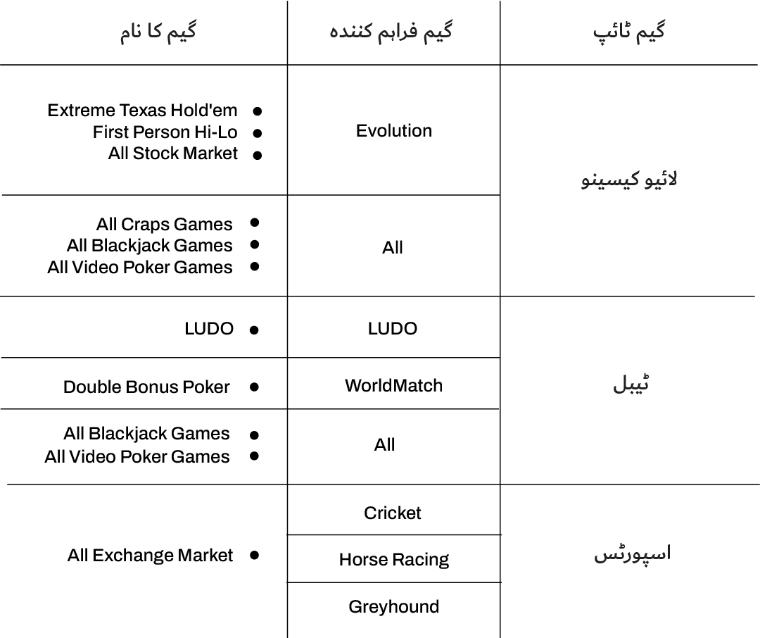 اگرچہ ہمارے پلیٹ فارم پر لگائی گئی زیادہ تر شرطوں کو ٹرن اوور کی کیلکولیشن میں شامل کیا جاتا ہے، اور ہم جو بونس پیش کرتے ہیں وہ وسیع پیمانے پر گیمز پر استعمال کیے جا سکتے ہیں، لیکن کچھ استثنیٰ بھی موجود ہیں۔ بونس ویجرنگ اور ٹرن اوور کی کیلکولیشن سے خارج شدہ گیمز کی مکمل تفصیلات جاننے کیلئے، براہ کرم نیچے دیا گیا ٹیبل ملاحظہ کریں: